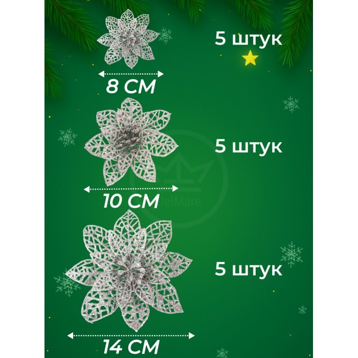 Набор Цветы Пуансеттия (15 штук - 8см-5шт/10см-5шт/14см--5шт+зажимы 15шт) серебро 266225