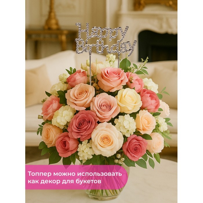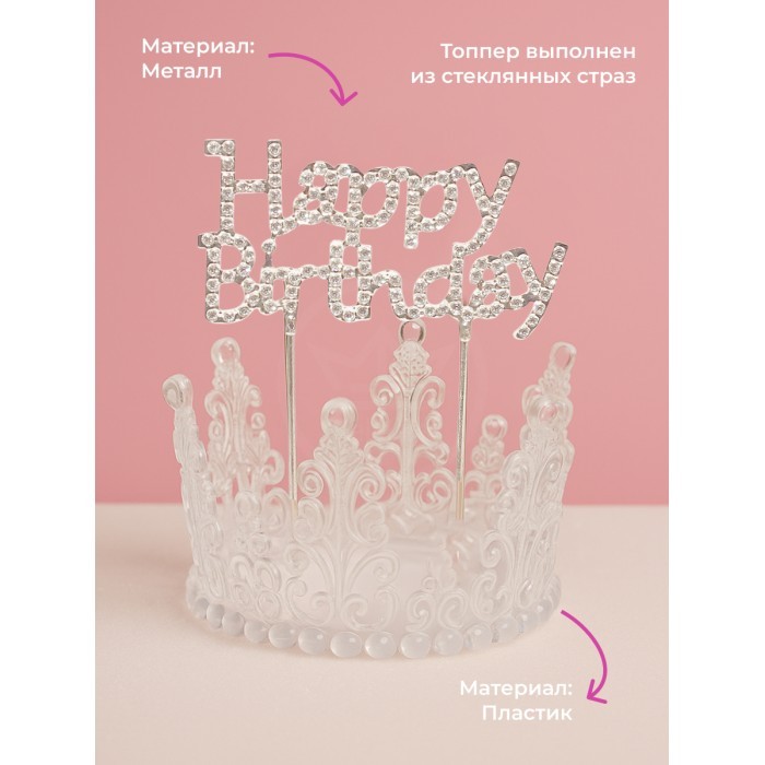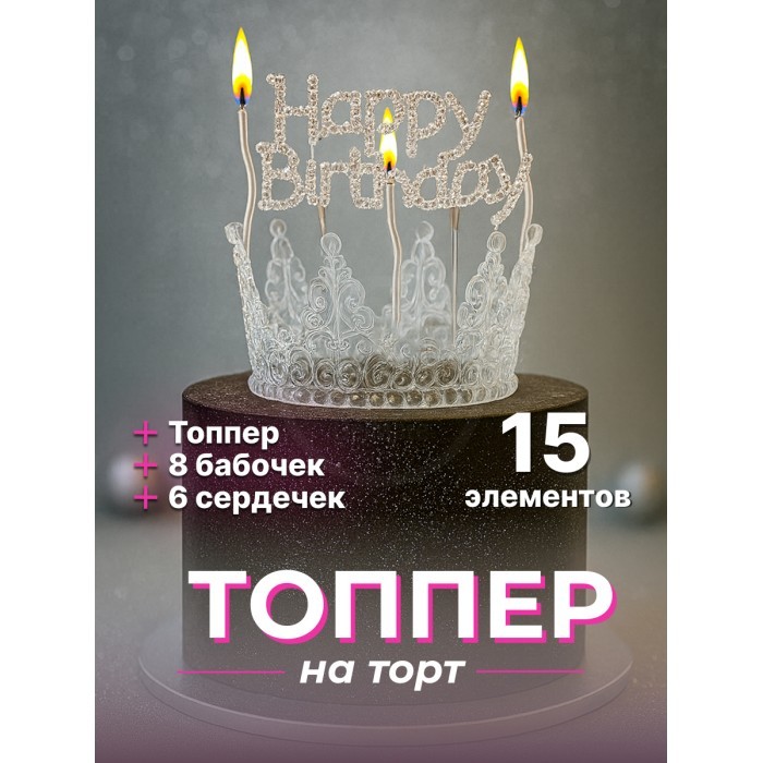 Корона на торт прозрачная+топпер Happy birthday (1шт) +Свечи (3 шт), серебро 266161